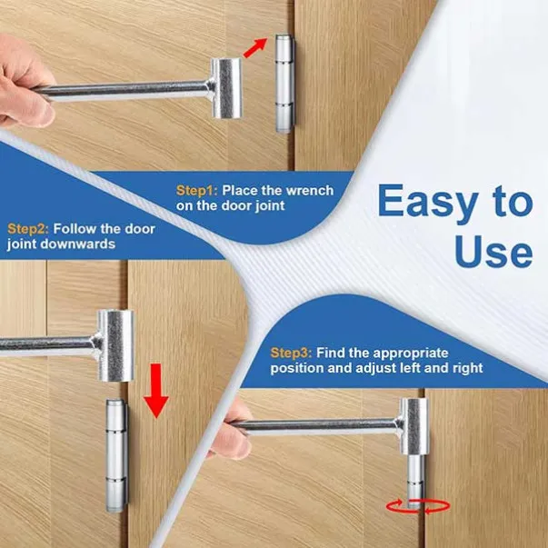 S preprostim obratom v levo razširite režo, z obratom v desno pa jo zožite. Orodje omogoča natančno prilagoditev tečajev, kar odpravlja zatikanje, trenje in nepravilno zapiranje vrat. Rezultat so vrata, ki se zapirajo kot nova.